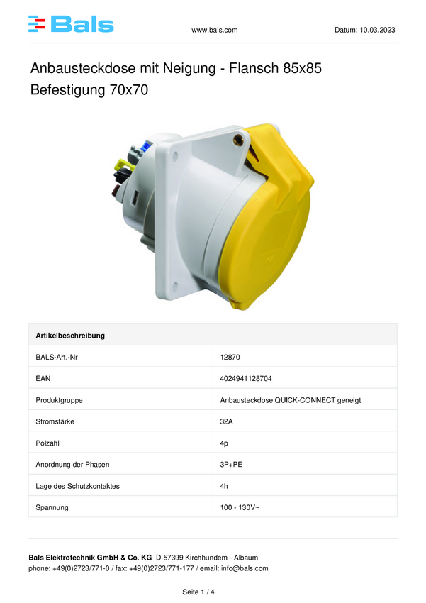 Puszka montażowa CEE Bals Elektrotechnik 12870 32.0 A 110 V