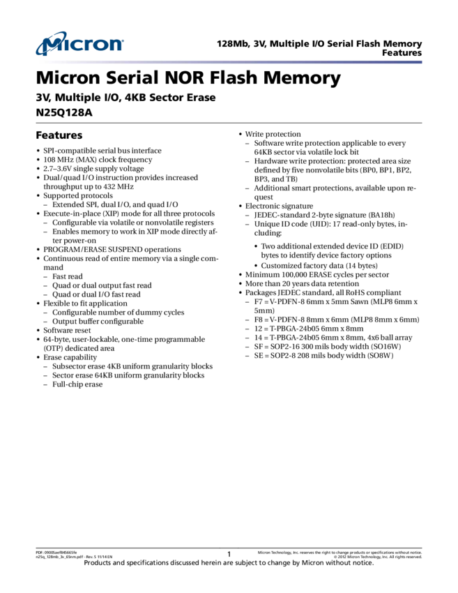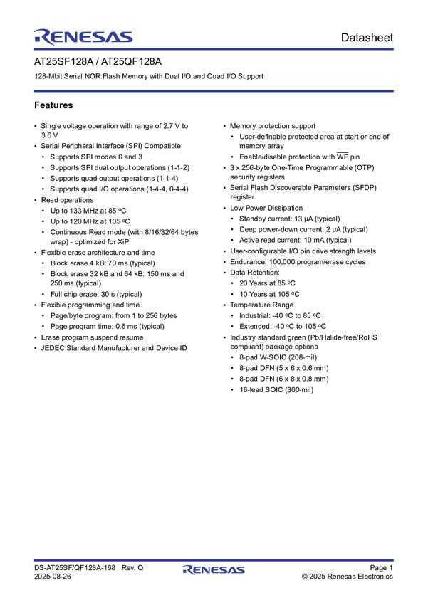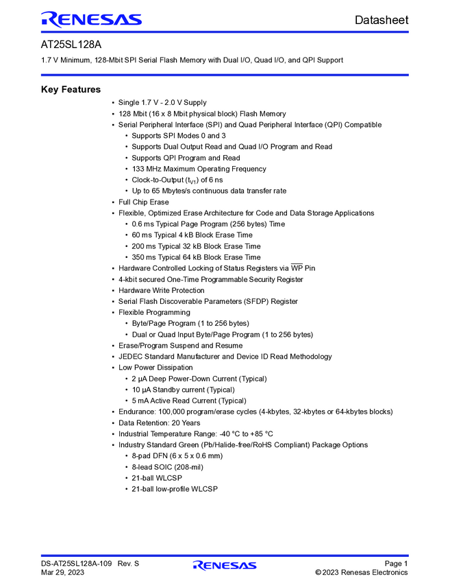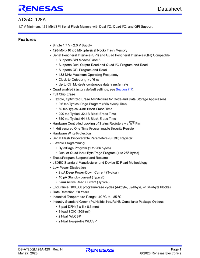 128Mbit, 1.7V Minimum SPI Serial Flash Memory with Dual I/O, Quad I/O and QPI Support