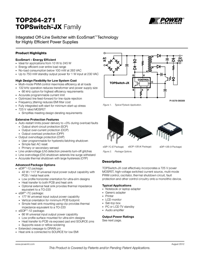 Układ scalony; TOP264VG; PMIC; AC/DC switcher; kontroler SMPS; 59,4-145kHZ; 8,35R; eDIP-12B; THT; TOP264VG; POWER INTEGRATIONS