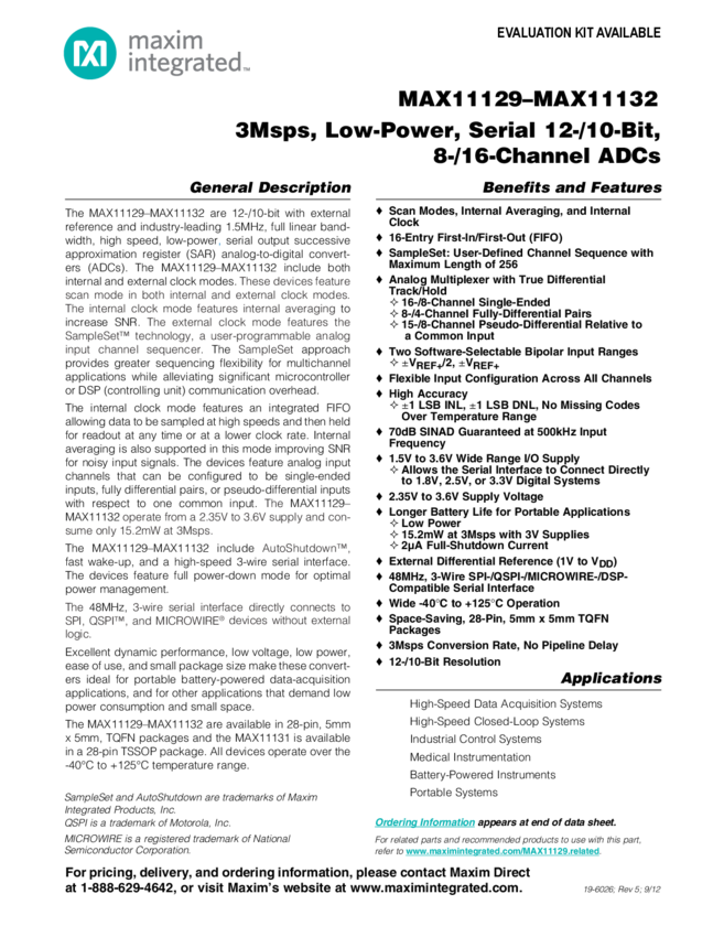 MAX11132 3Msps 8 channel 12bit Analog-to-Digital Converter with SampleSet