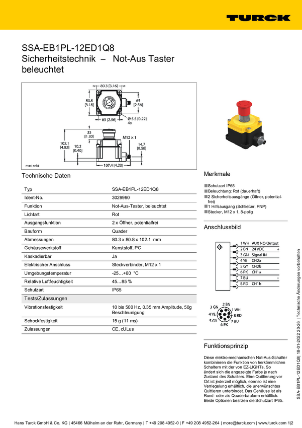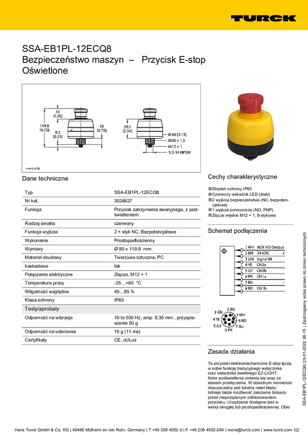 Turck SSA-EB1PL-12ECQ8 Przycisk zatrzymania awaryjnego IP65 1 szt.