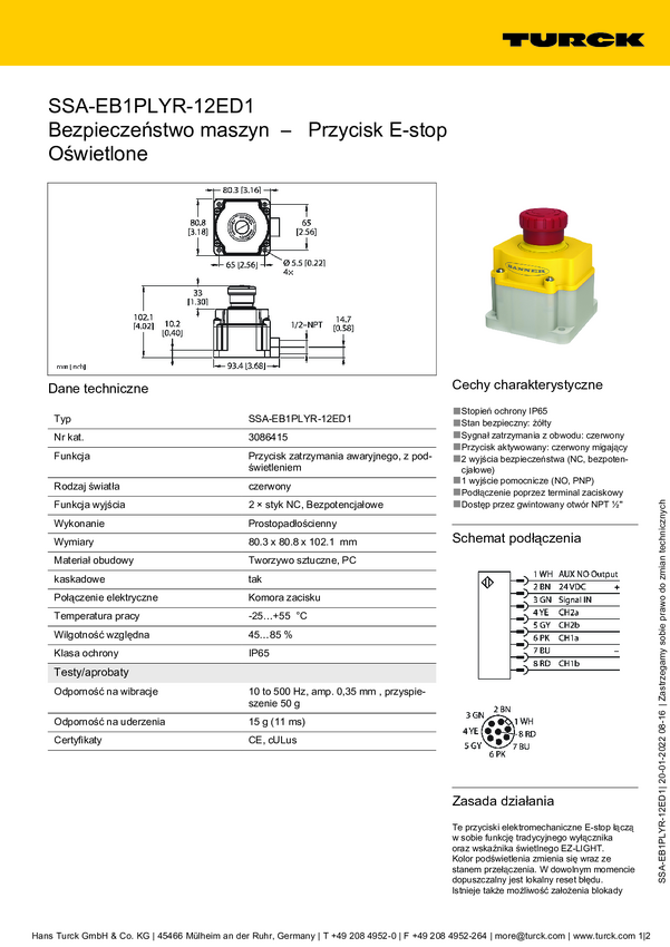 Turck SSA-EB1PLGR-12ED1Q8 Przycisk zatrzymania awaryjnego IP65 1 szt.
