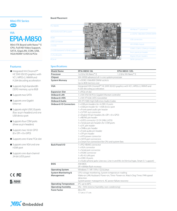 Płyta główna Mini-ITX VIA EPIA M850-12EL, bezwiatrakowa, 1.2 GHz Nano E CPU, 1 PCIe x4, 8 USB, 4 COMs, 1 GLAN, 1 VGA, 1 HDMI, 1 LVDS