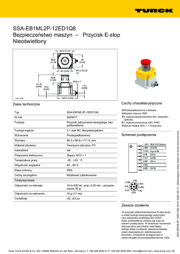 Turck SSA-EB1ML2P-12ED1Q8 Przycisk zatrzymania awaryjnego IP65 1 szt.