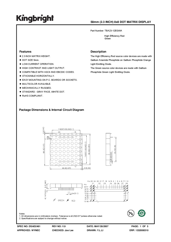 Displays Dot Matrix Module 64LED Green/Red 24-Pin DIP Tube