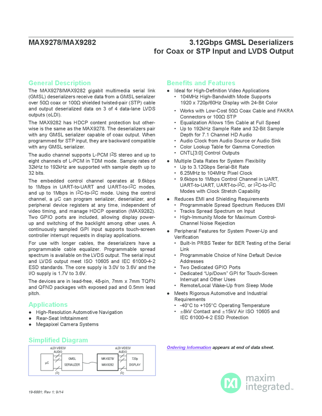 MAX9278, MAX9282 3.12Gbps GMSL Deserializers for Coax or STP Input and LVDS Output