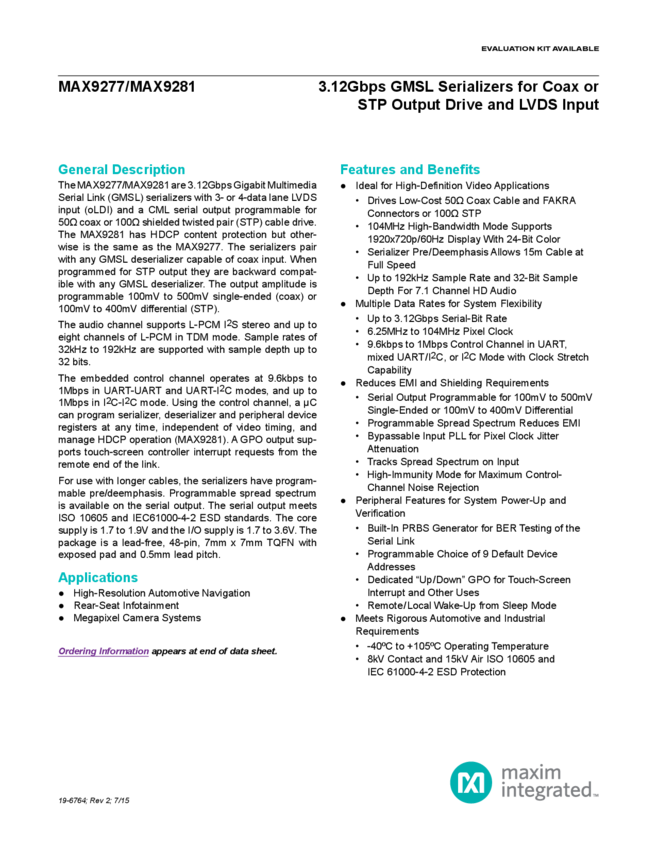 MAX9277, MAX9281 3.12Gbps GMSL Serializers for Coax or STP Output Drive and LVDS Input