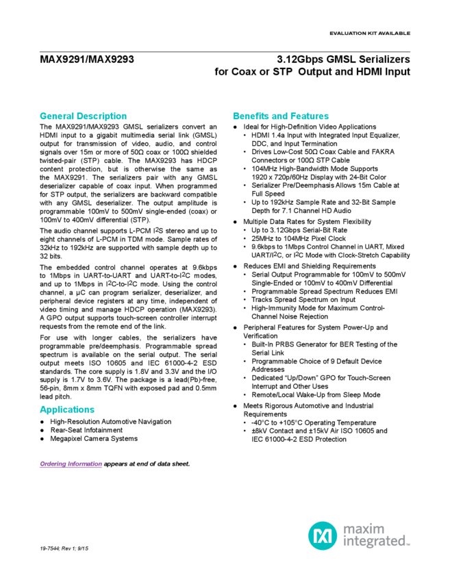 MAX9293 3.12Gbps Gigabit Multimedia Serial Link (GMSL) Serializer with HDCP & HDMI Inputs for Coax and STP Cables