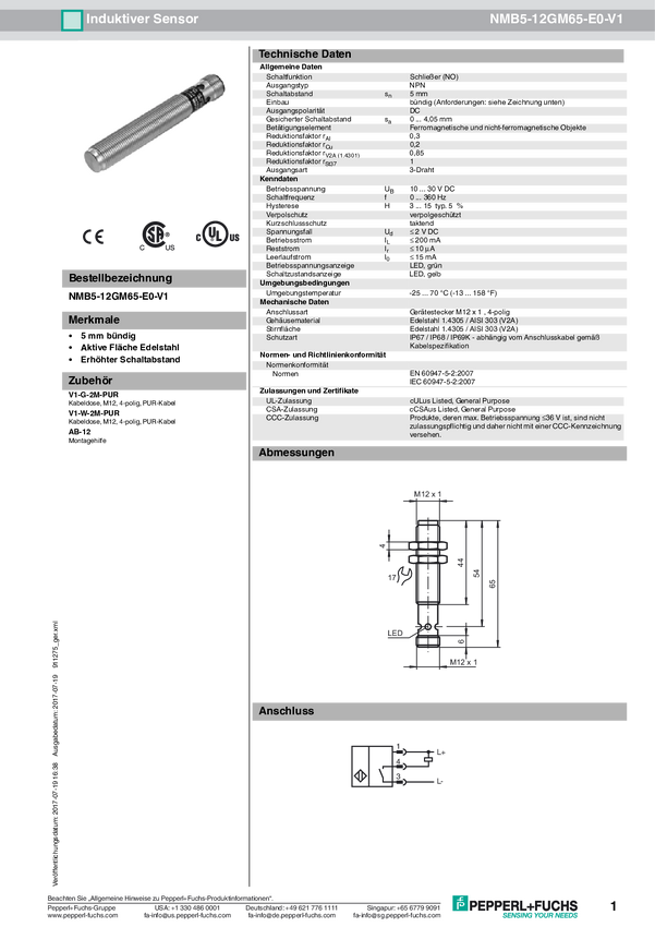 Pepperl+Fuchs Czujnik indukcyjny podtynkowy PNP NRB3-12GM40-E2-C-V1