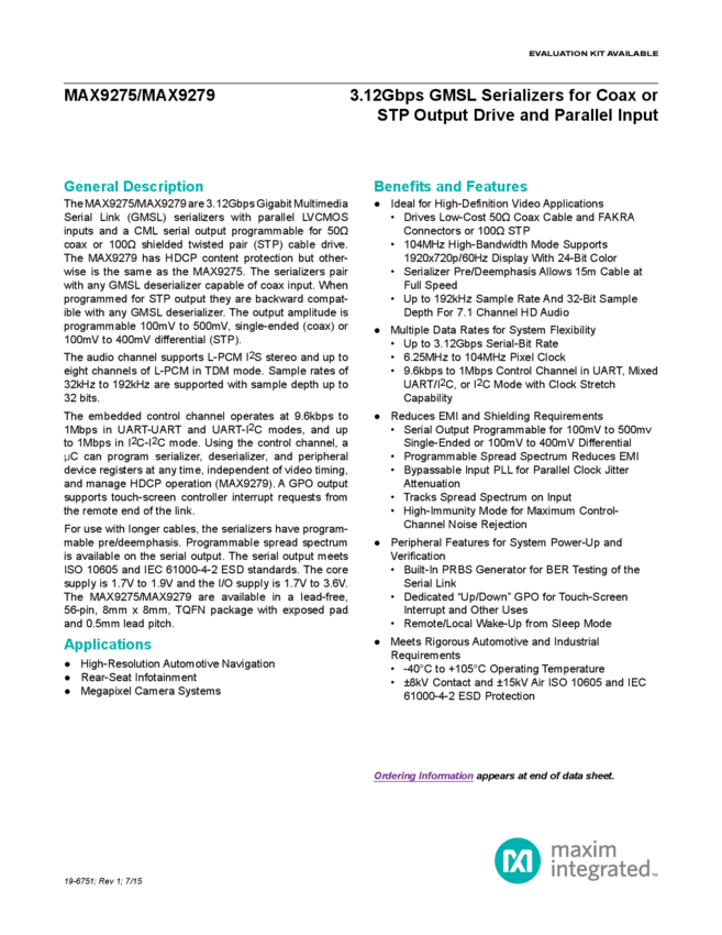 MAX9275, MAX9279 3.12Gbps GMSL Serializers for Coax or STP Output Drive and Parallel Input