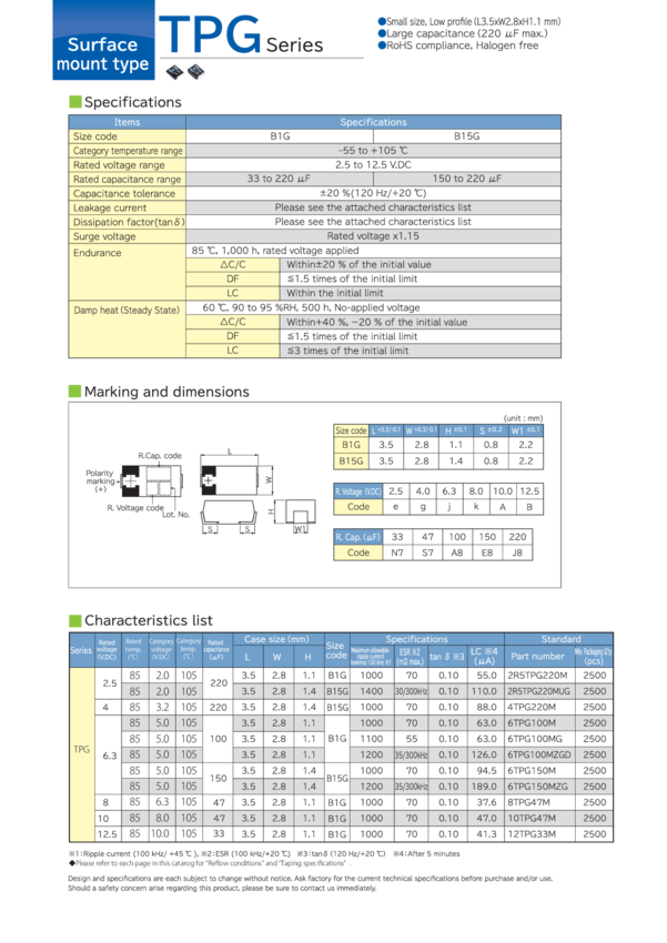 Cap Tant Solid 150uF 6.3V B15G CASE 20% (3.5 X 2.8 X 1.4mm) SMD 3528,B15G 0.07Ohm 105°C Embossed T/R