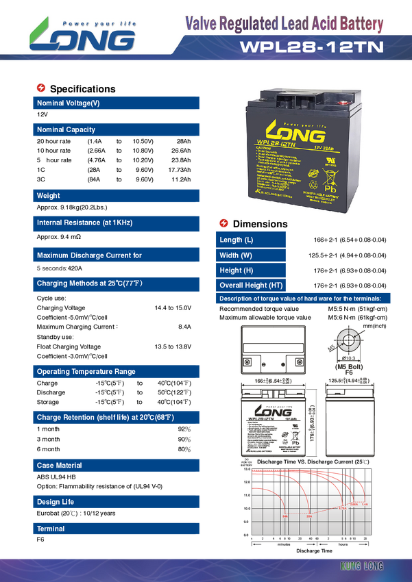 Long WPL28-12TN WPL28-12TN Akumulator ołowiowy 12 V 28 Ah AGM (S x W x G) 166 x 176 x 126 mm połączenie śrubowe M5 minim