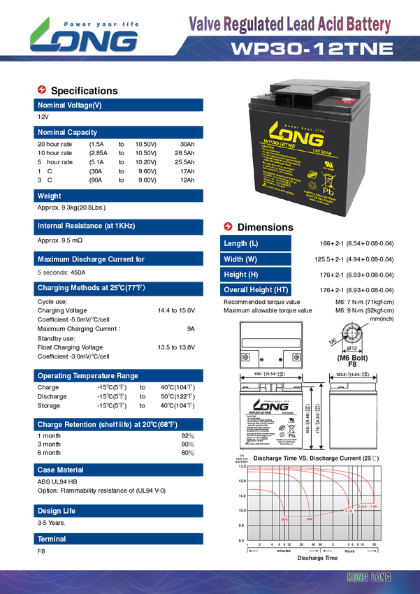 Long WP30-12TNE WP30-12TNE Akumulator ołowiowy 12 V 30 Ah AGM (S x W x G) 166 x 176 x 125 mm połączenie śrubowe M6 stabi