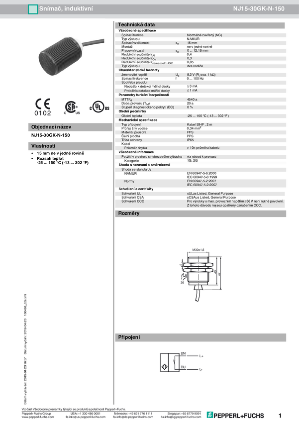 Czujnik indukcyjny Pepperl+Fuchs NJ15-30GK-N-150 12xGxxxD 70133189 1 szt.
