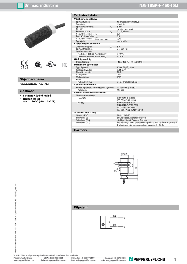 Czujnik indukcyjny Pepperl+Fuchs NJ8-18GK-N-150-15M 12xGxxxD 70133188 1 szt.