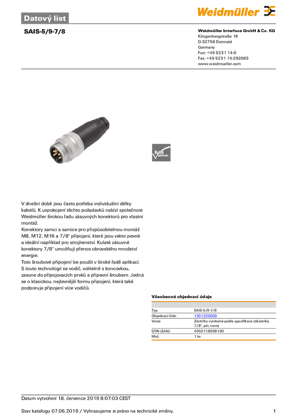 Złącze czujników/elementów wykonawczych Weidmüller SAIS-5/9-7/8" 1301220000 IP 67 1 szt.
