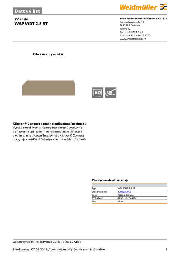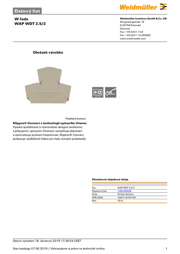 Płyta zamykająca Weidmüller WAP WDT 2.5/2 1305260000, 50 szt.