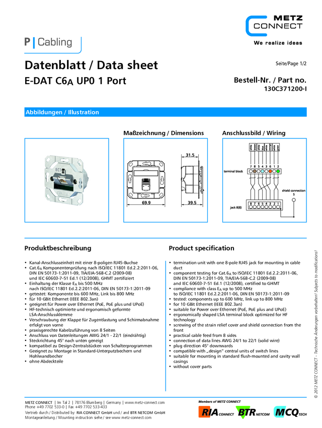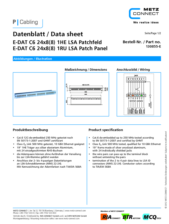 Metz Connect 130855C-E 24 Porty 483 mm (19") CAT 6a 1 U srebrny (metaliczny) Zamontowany