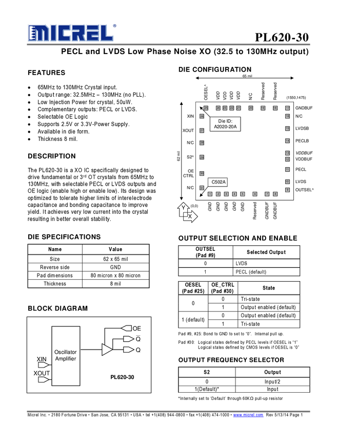 PL620-30 - PECL and LVDS Low Phase Noise XO (32.5 to 130MHz Output)