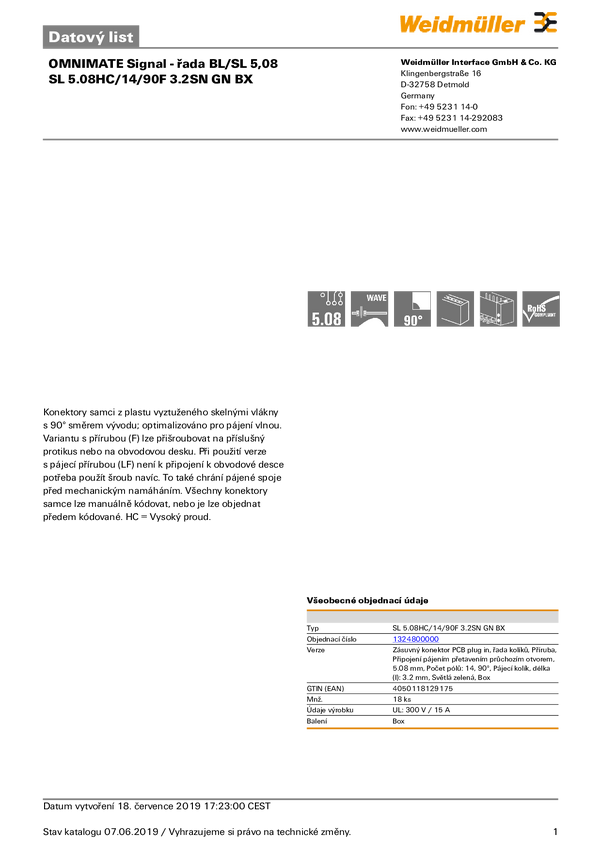 Weidmüller Obudowa złącza pin męskiego na PCB SL Ilość pinów 14 Wymiary siatki: 5.08 mm 1324800000 50 szt.