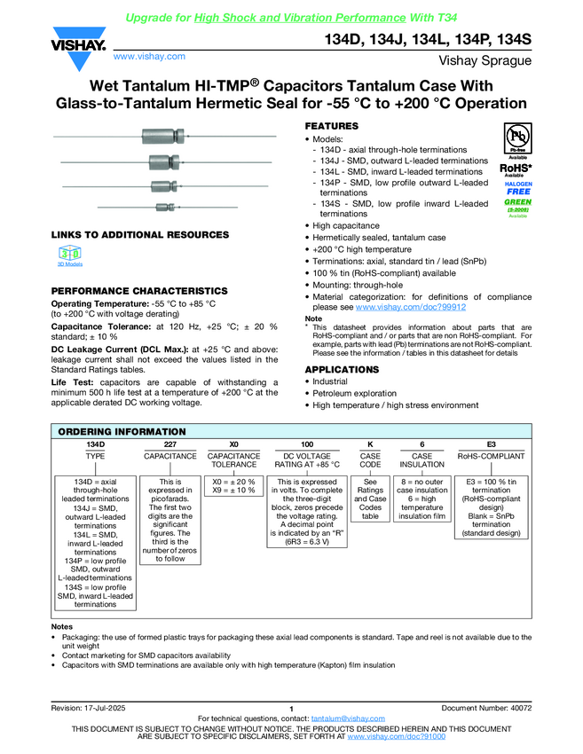 Wet Tantalum HI-TMP® Capacitors Tantalum Case With Glass-to-Tantalum Hermetic Seal for -55 °C to +200 °C Operation