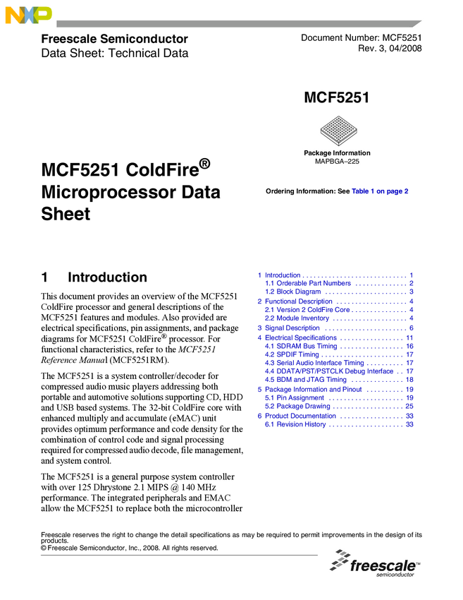 ColdFire 32-bit MPU, ColdFire core, 140MHz, MAPBGA 225