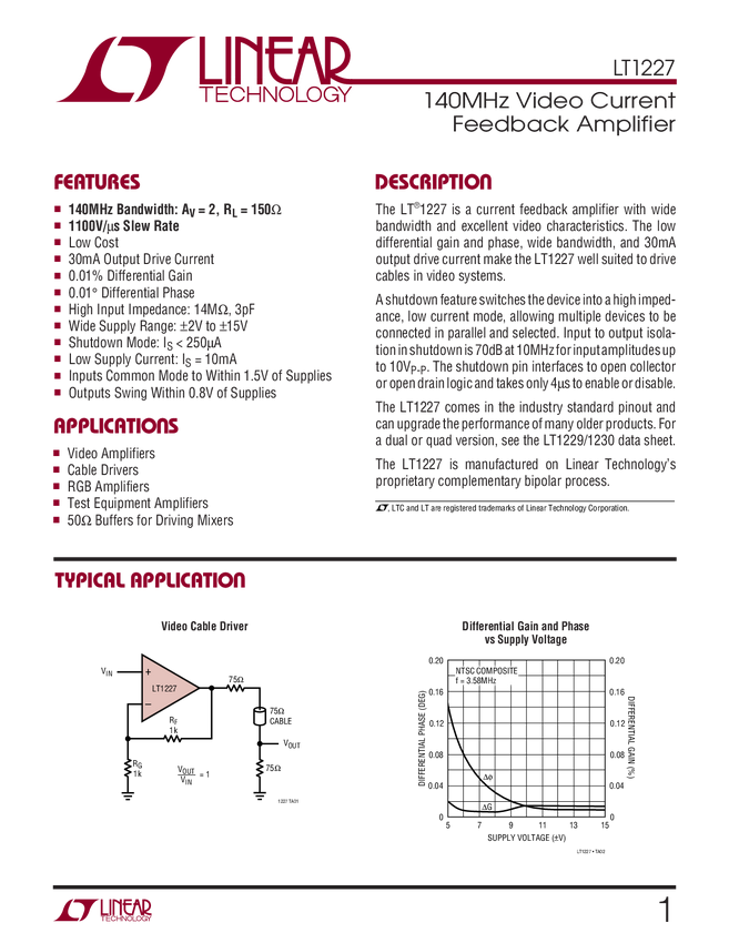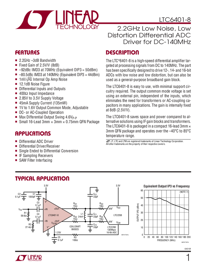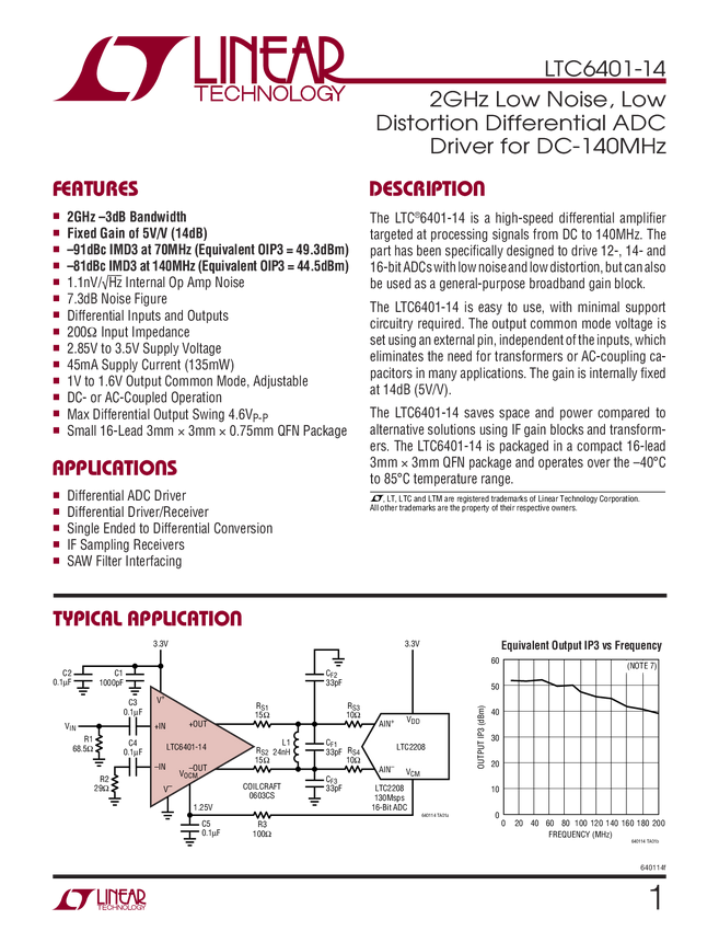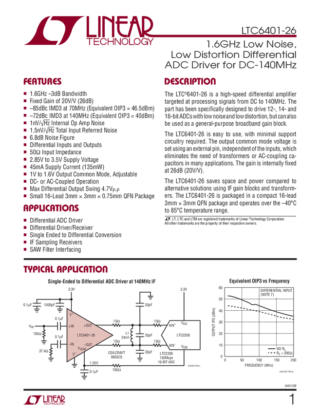 1.6GHz Low Noise, Low Distortion Differential ADC Driver for DC-140MHz