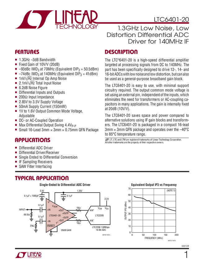 1.3GHz Low Noise, Low Distortion Differential ADC Driver for 140MHz IF