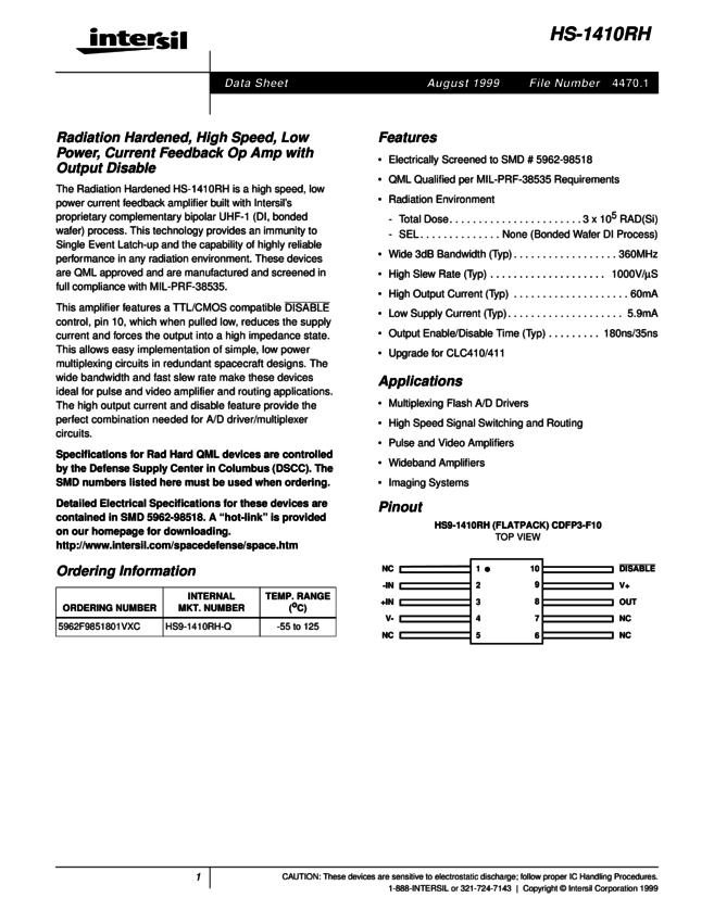 Rad-Hard, High Speed, Low Power, Current Feedback Op Amp with Output Disable