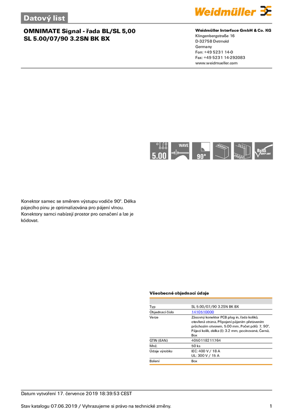 Weidmüller 1410510000 Obudowa złącza pin męskiego na PCB SL 5.00/07/90 3.2SN BK BX, 50 szt.