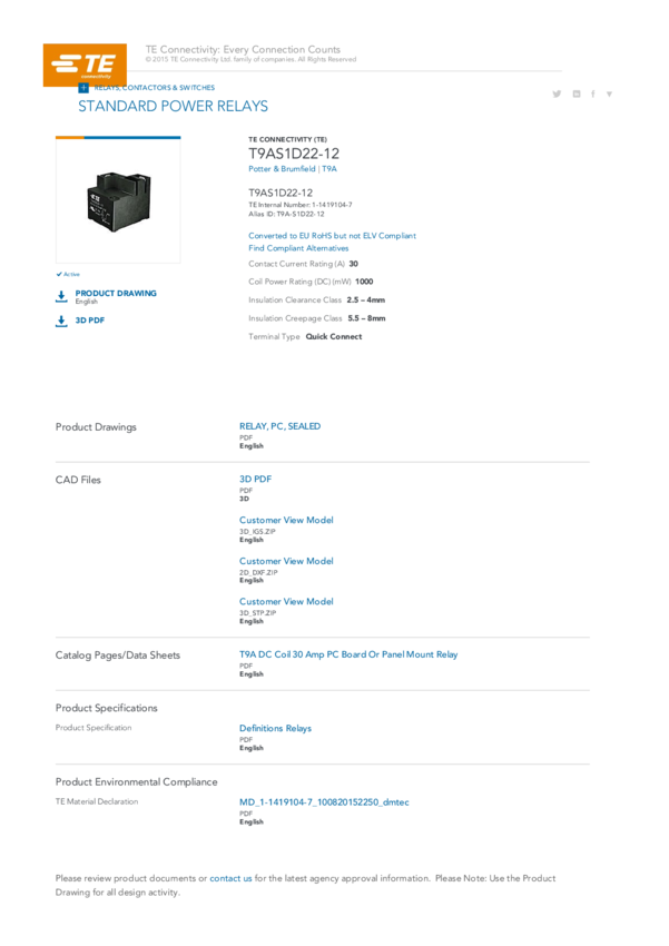 Electromechanical Relay SPST-NO 30A 12VDC 144Ohm Through Hole