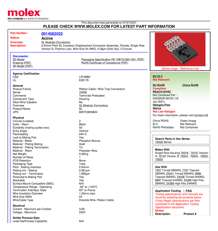 Molex 14562022 Obudowa złącza pin żeńskiego na kabel, piny: 2, 3 A, 1 szt.