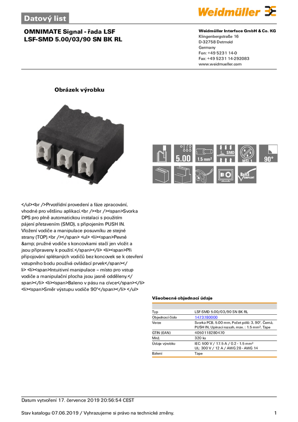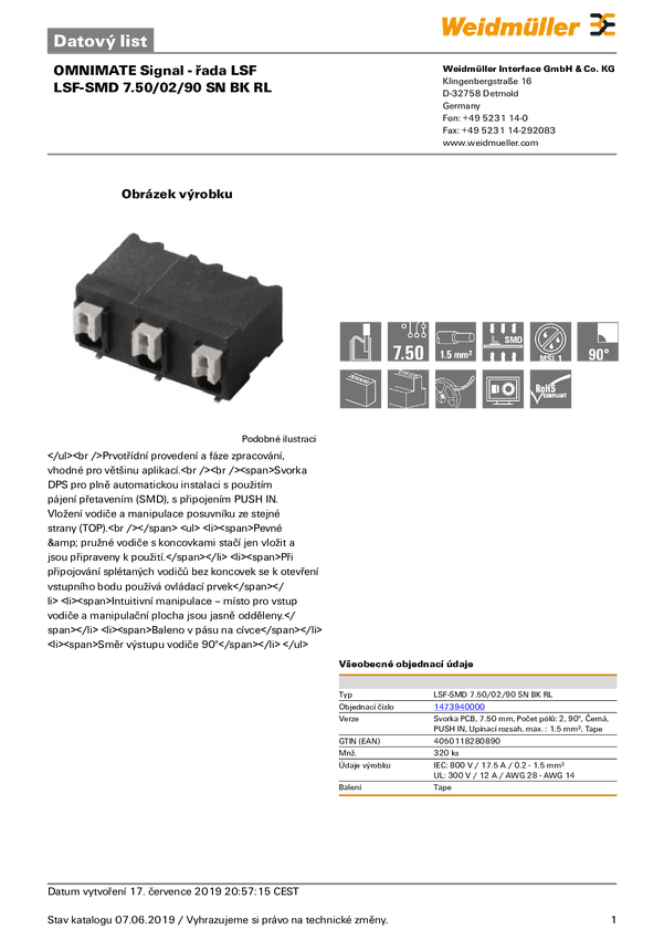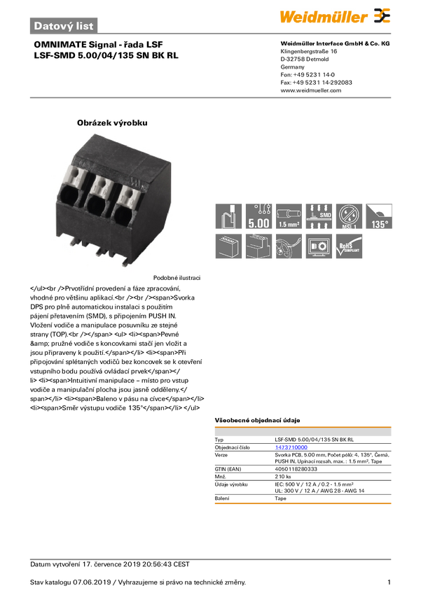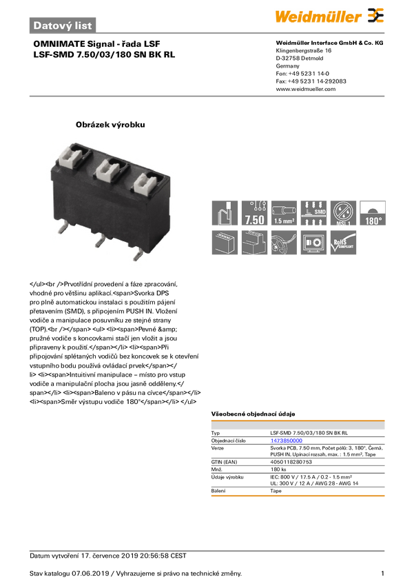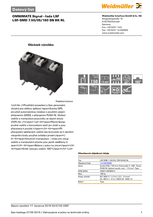 Weidmüller 1473670000 Zacisk sprężynowy 1.5 mm² Ilość styków 7 czarny 180 szt.