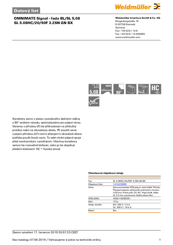 Weidmüller 1475570000 Złącze męskie PCB Łączna ilość styków 20 12 szt.