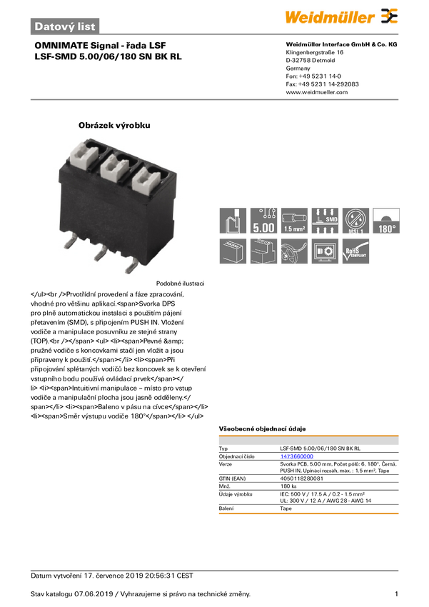 Weidmüller 1473660000 Zacisk sprężynowy 1.5 mm² Ilość styków 6 czarny 180 szt.