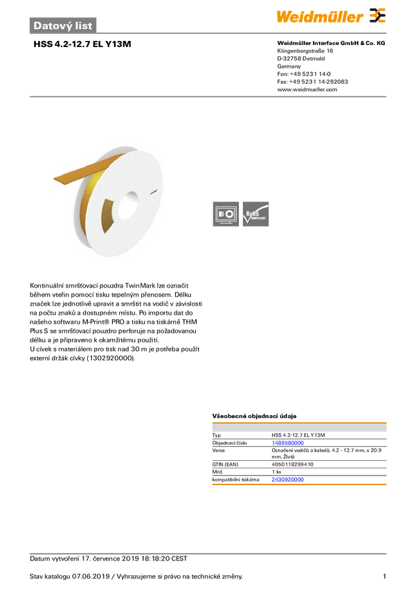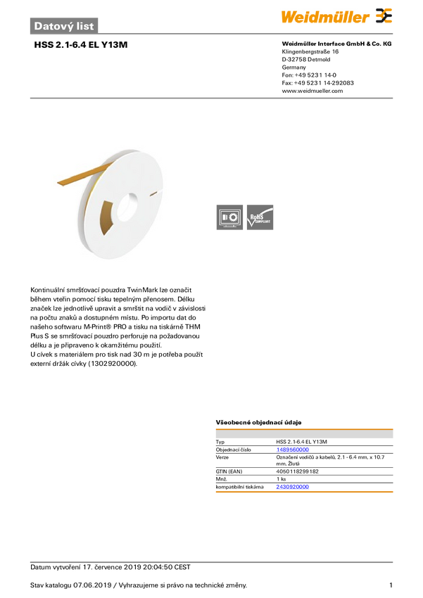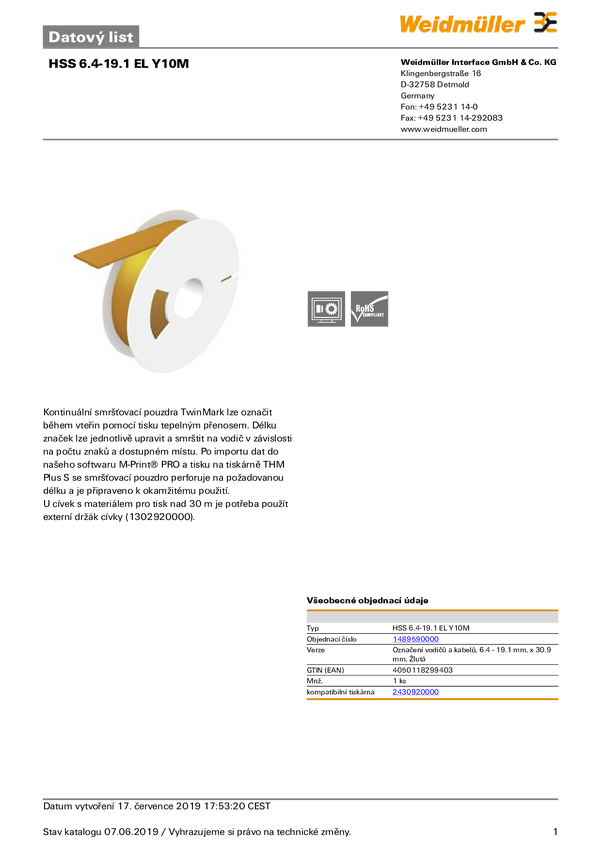 Weidmüller 1489590000 HSS 6.4-19.1 EL Y10M Tabliczka znamionowa żółty 10 m