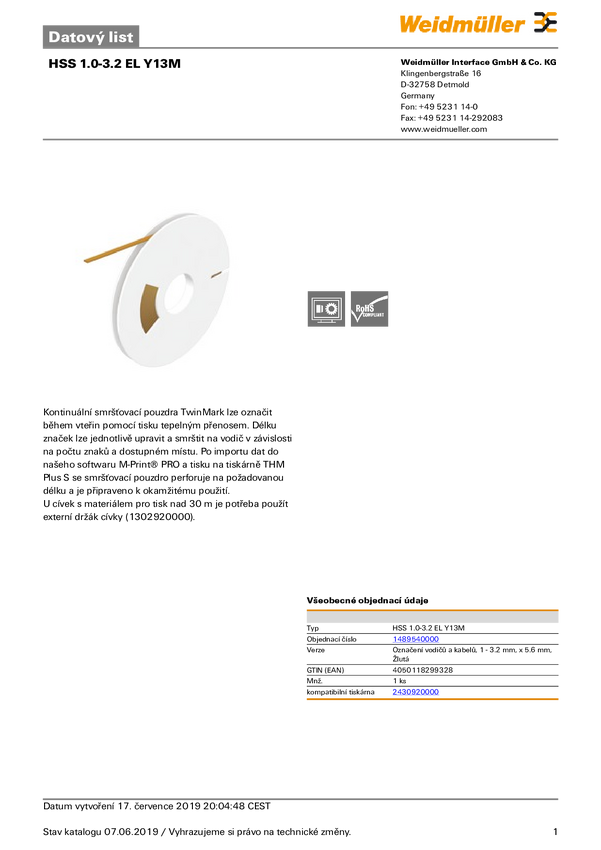 Weidmüller 1489540000 HSS 1.0-3.2 EL Y13M System znakowania kabli żółty 1 szt.