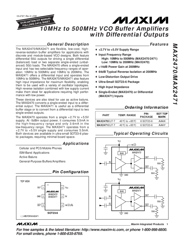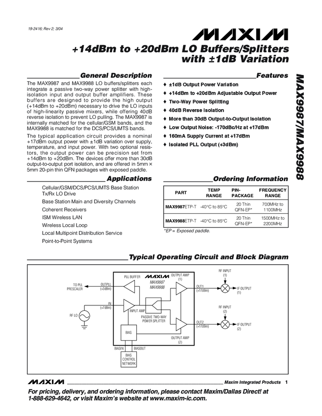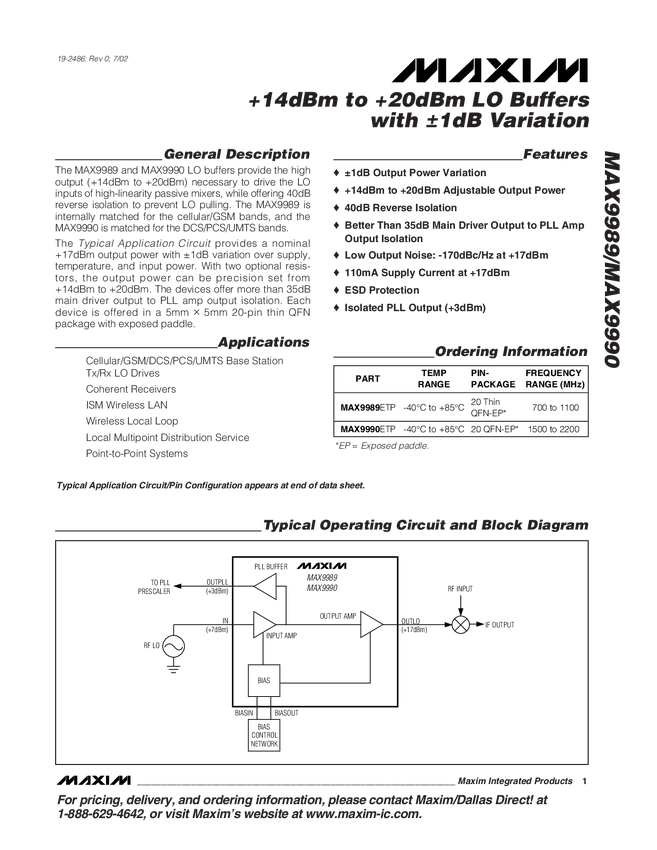 MAX2470 DCS/PCS Band +14dBm to +20dBm LO Buffers with &#1771dB Variation