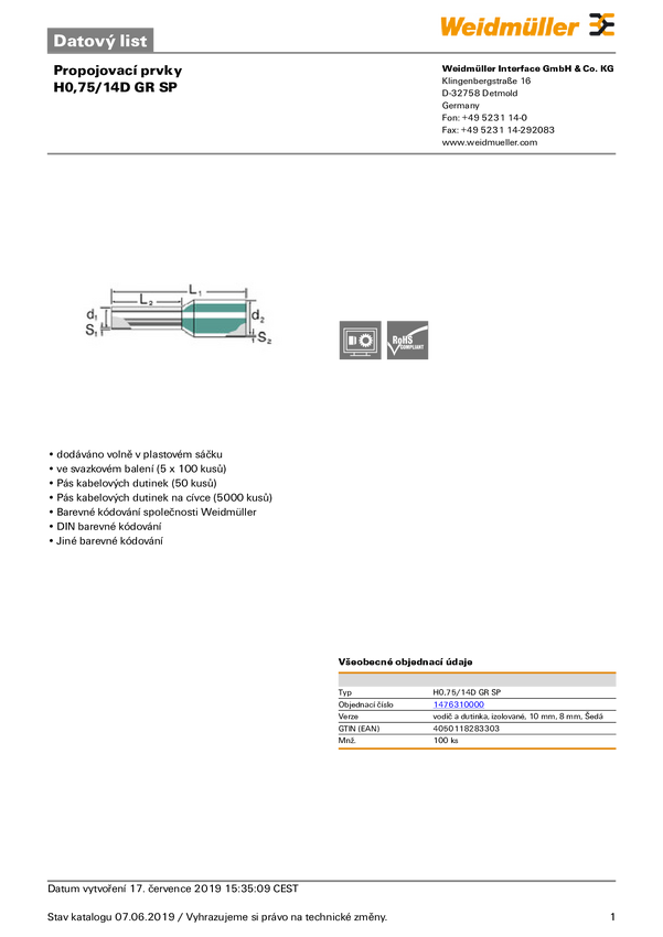 Weidmüller 1476310000 Końcówka rurkowa H0,75/14D GR SP, z częściową izolacją , 0.75 mm² x 8 mm, 100 szt.