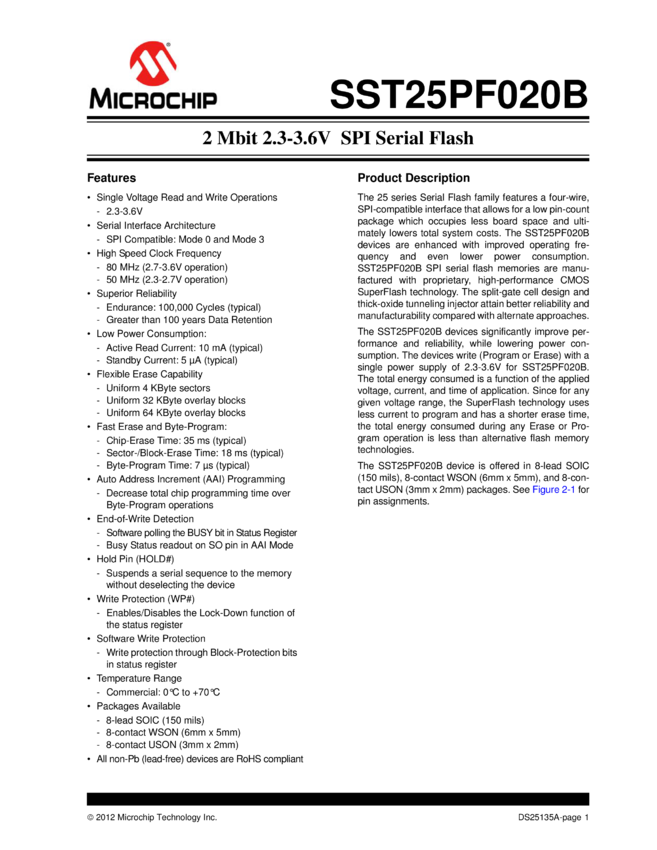 2 Mbit 2.3-3.6V SPI Serial Flash--SST25PF020B (11/15/2012)