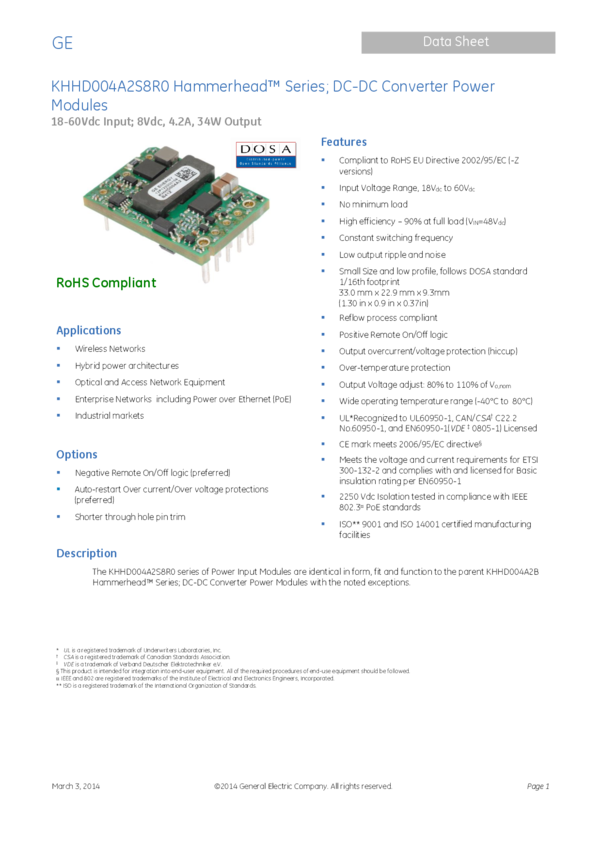 Module DC-DC 1-Out 8V 4.2A 34W 8-Pin 1/16-Brick Tray