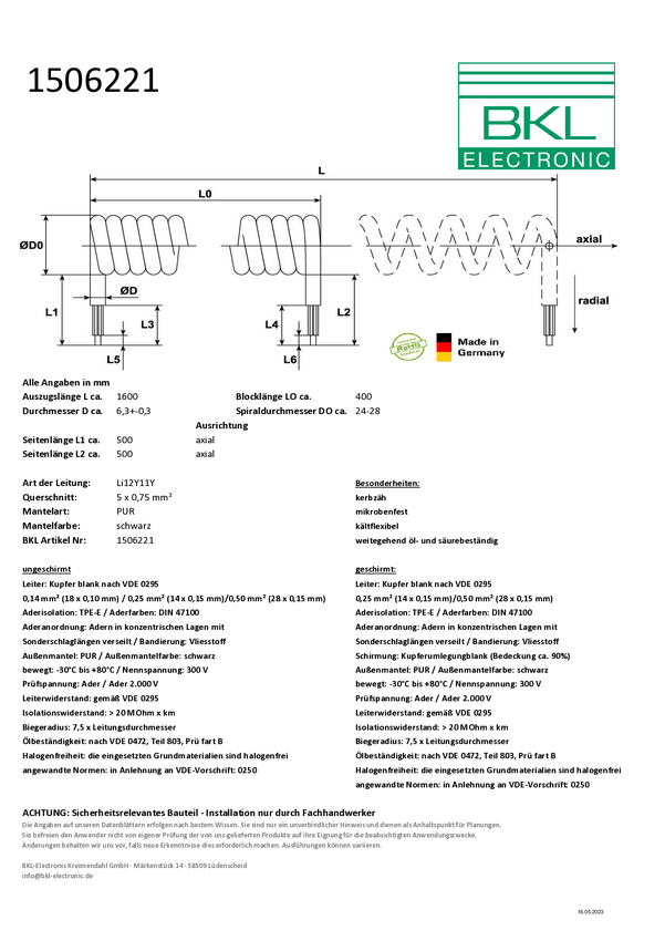 Przewód spiralny BKL Electronic 1506221, 5 x, od 400 mm do 1600 mm, 1 szt.
