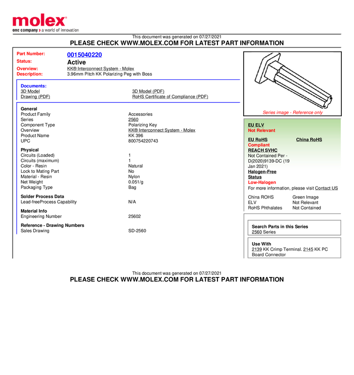 Molex Pin kodujący Ilość pinów 1 15040220 1 szt. torba