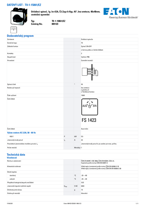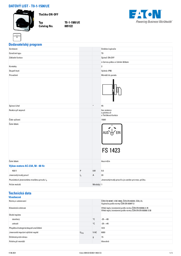 Eaton 009123 T0-1-15061/EZ Przycisk ON/OFF 1 szt.