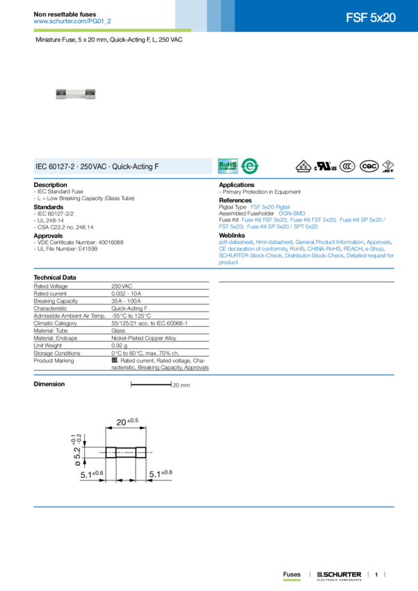 Fuse Miniature 0.1A 250V Fast 2-Pin Bulk