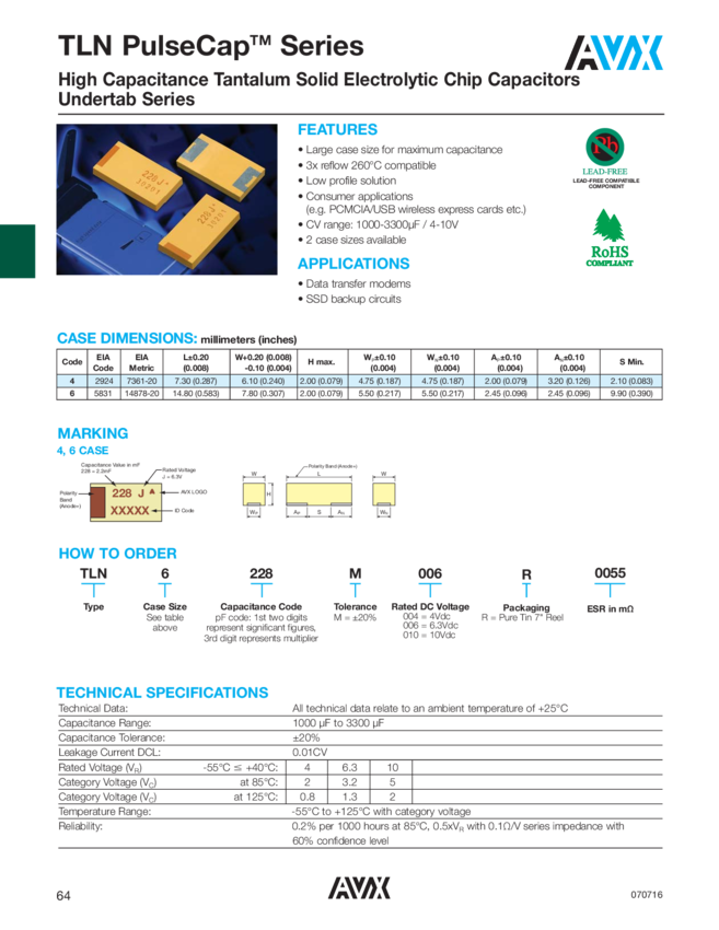 Cap Tant Solid 1500uF 6.3V 4 CASE 20% (7.3 X 6.1 X 2mm) SMD 7361-20 0.1 Ohm 125°C T/R
