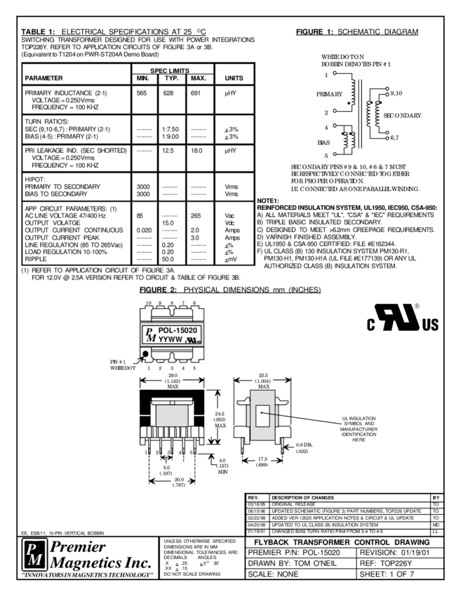 Power Transformer 7.5:1/9:1 Single+Auxilary Prim. Dual Sec. 265V Prim. 15V Sec. Through Hole