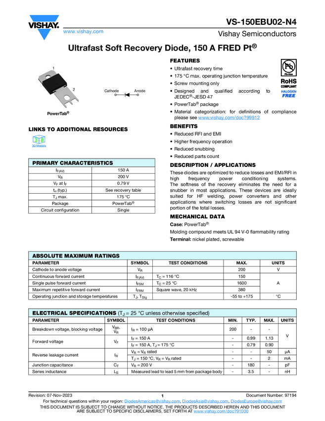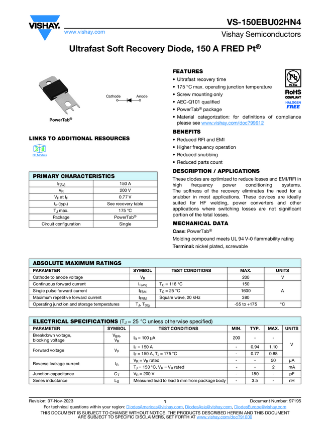 Ultrafast Soft Recovery Diode, 150 A FRED Pt®