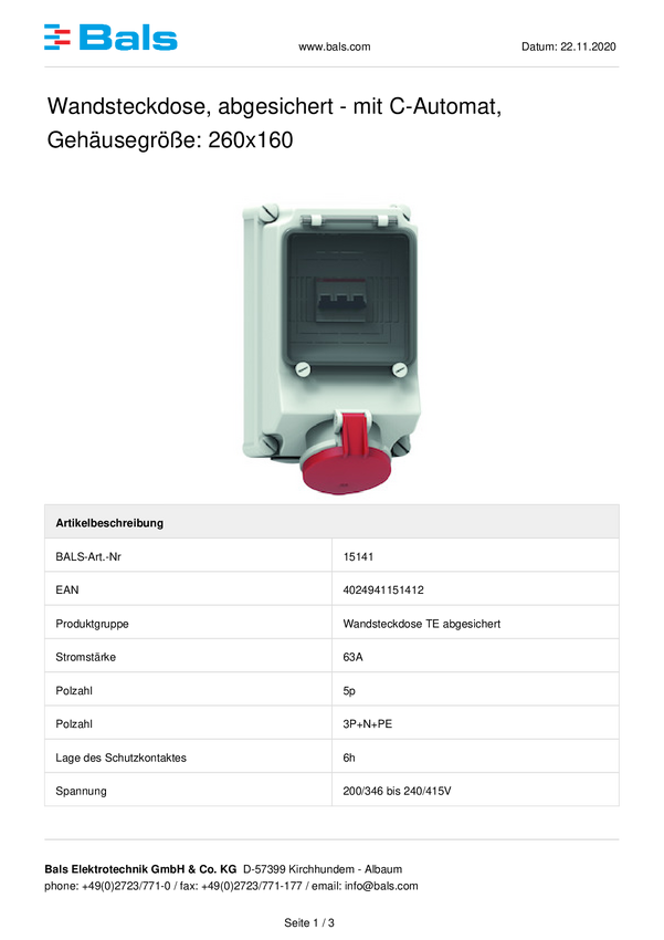 Gniazdo naścienne CEE Bals Elektrotechnik 15141 63.0 A 400 V