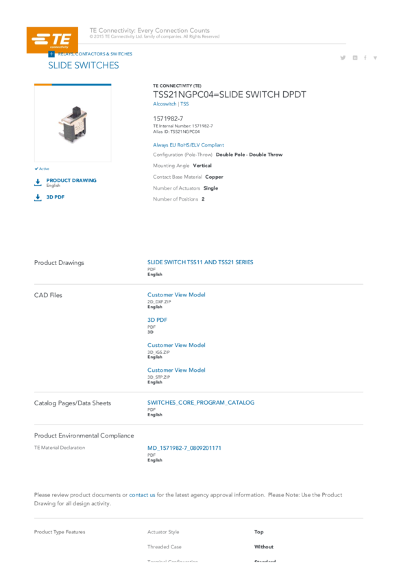 Switch Slide ON None ON DPDT Side Slide 20VAC 20VDC 0.4VA PC Pins Bracket Mount/Through Hole